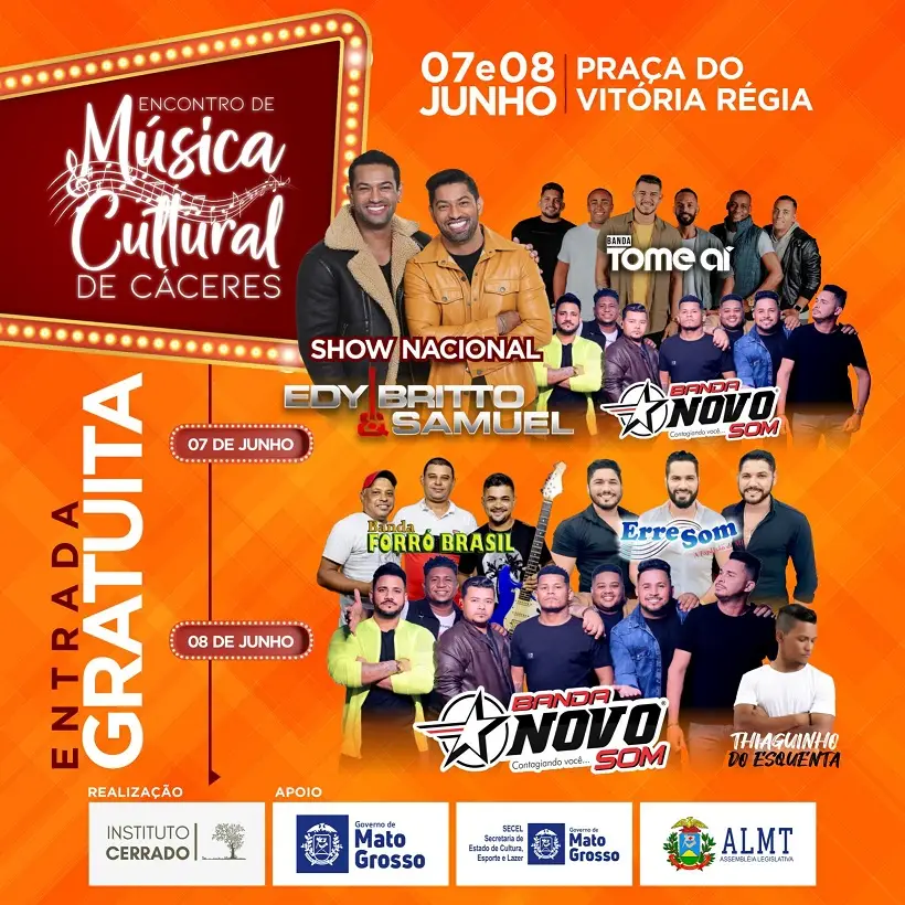 O Encontro de Música Cultural de Cáceres reúne Edy Brito e Samuel, Erre Som, Banda Novo Som e mais em shows imperdíveis nos dias 7 e 8 de junho. Entrada acessível!