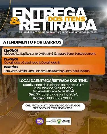 A Prefeitura de Cáceres, em compromisso com o bem-estar da população, anuncia a entrega de itens essenciais para as famílias impactadas pelas recentes chuvas a partir do dia 5 de junho de 2024. Para garantir a eficiência e agilidade da distribuição, as entregas serão realizadas por etapas, organizadas de acordo com os bairros afetados.
