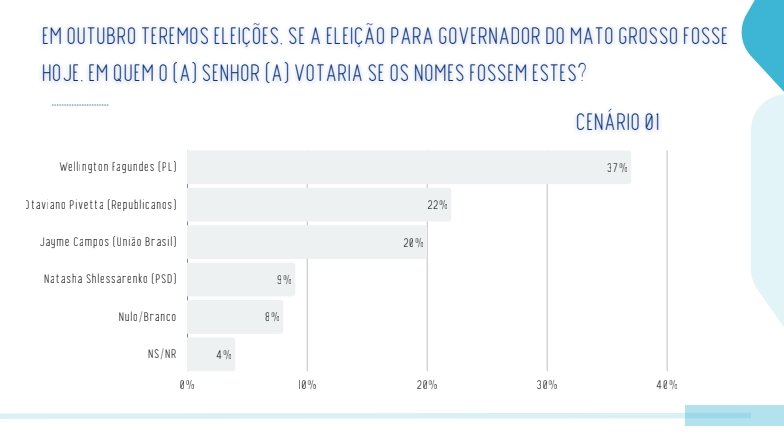 Na sequência, o vice-governador Otaviano Pivetta (Republicanos) soma 22%, configurando um empate técnico com o senador Jayme Campos (União), que aparece com 20%. A médica Natasha Slhessarenko (PSD) alcança 9% das intenções. Os votos nulos e brancos representam 8%, enquanto 4% dos entrevistados não souberam ou não responderam.