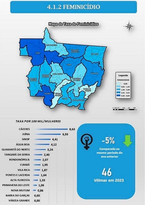Embora o Anuário aponte uma queda de 5% no número de feminicídios em Mato Grosso durante 2023, na comparação com 2022, a região de Cáceres, junto com Sinop, concentra o maior número de casos no estado, com 8 mortes violentas de mulheres cada uma, totalizando 16. Ao todo, foram registrados 46 feminicídios em Mato Grosso no ano passado.
